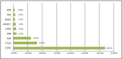 根據一份2012年的微信用戶屬性數據顯示,微信用戶中男性占了63%,而從年齡分布來看20-30歲之間的青年占了74%。目前,微信用戶群具有年輕化、男性居多的特征,從職業分布來看,擁有大量碎片時間的大學生是主體。大學生占了64%,其次是IT行業和白領,這三類人占了微信用戶總數的90%。